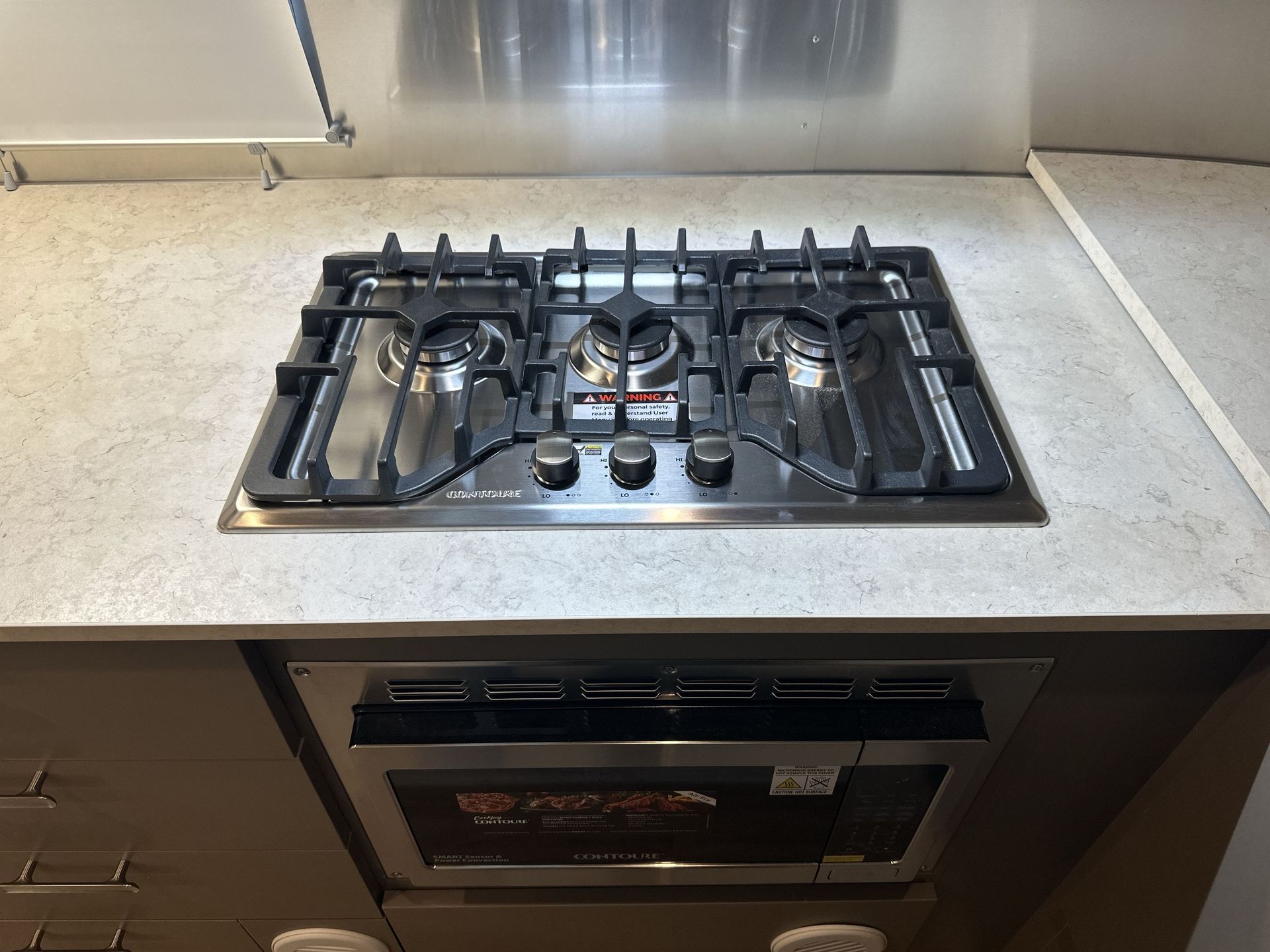 Inside, the 20FB features a thoughtfully designed floor plan that maximizes every inch of space. The front bedroom includes a cozy double bed with ample under-bed storage, providing a restful retreat after a day of exploration. The rear kitchen is equipped with a three-burner stove, convection microwave, and a compact refrigerator, making meal preparation convenient and enjoyable. The central dinette offers a comfortable area for dining or relaxation and can convert into additional sleeping space for guests.