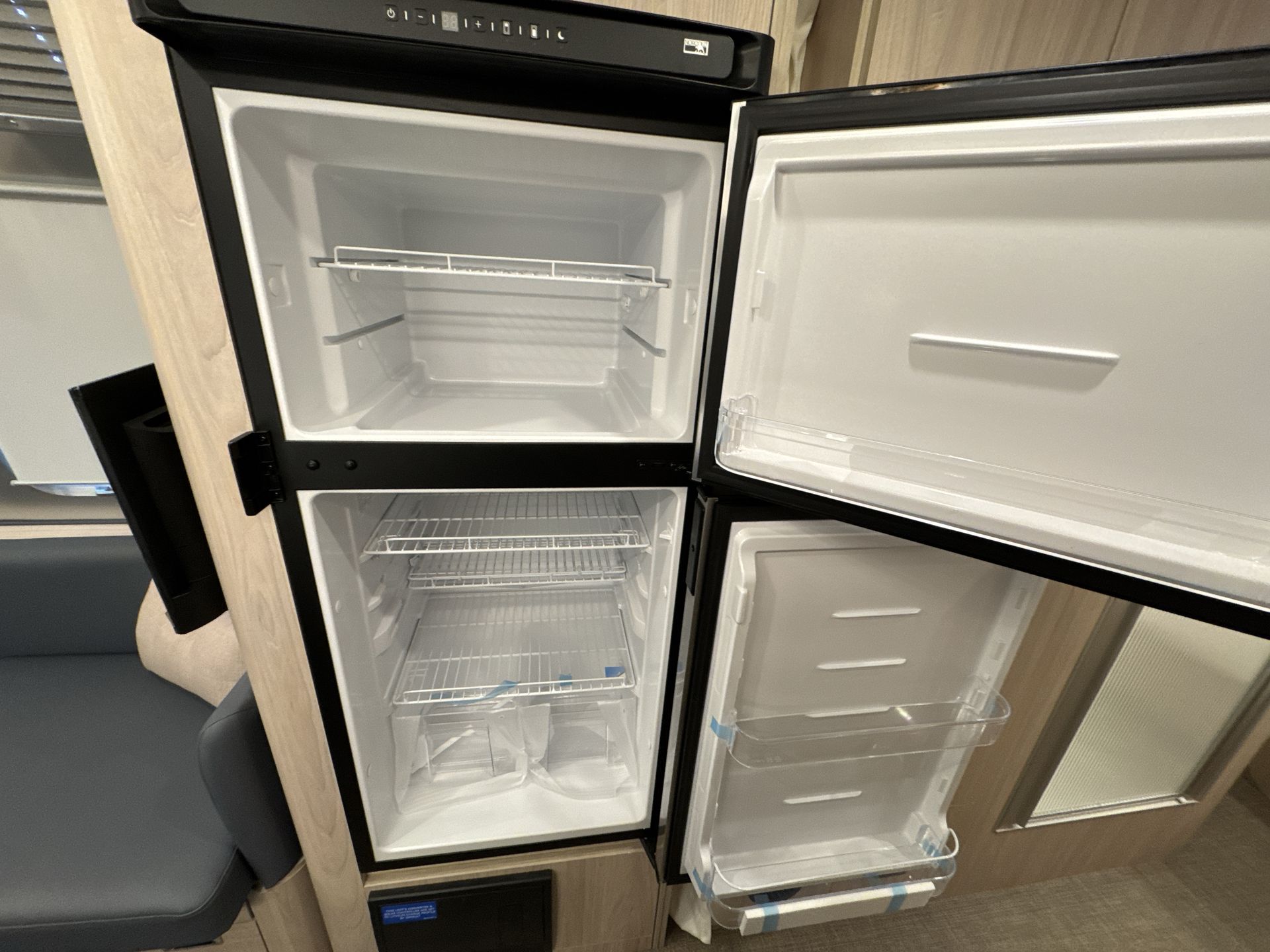 Inside, the 27FB Queen offers a spacious and thoughtfully arranged interior. The front features a comfortable queen-size bed with an AdaptaFlex memory foam mattress, flanked by nightstands and illuminated by panoramic windows that fill the space with natural light. For privacy, blackout curtains are easily accessible.
