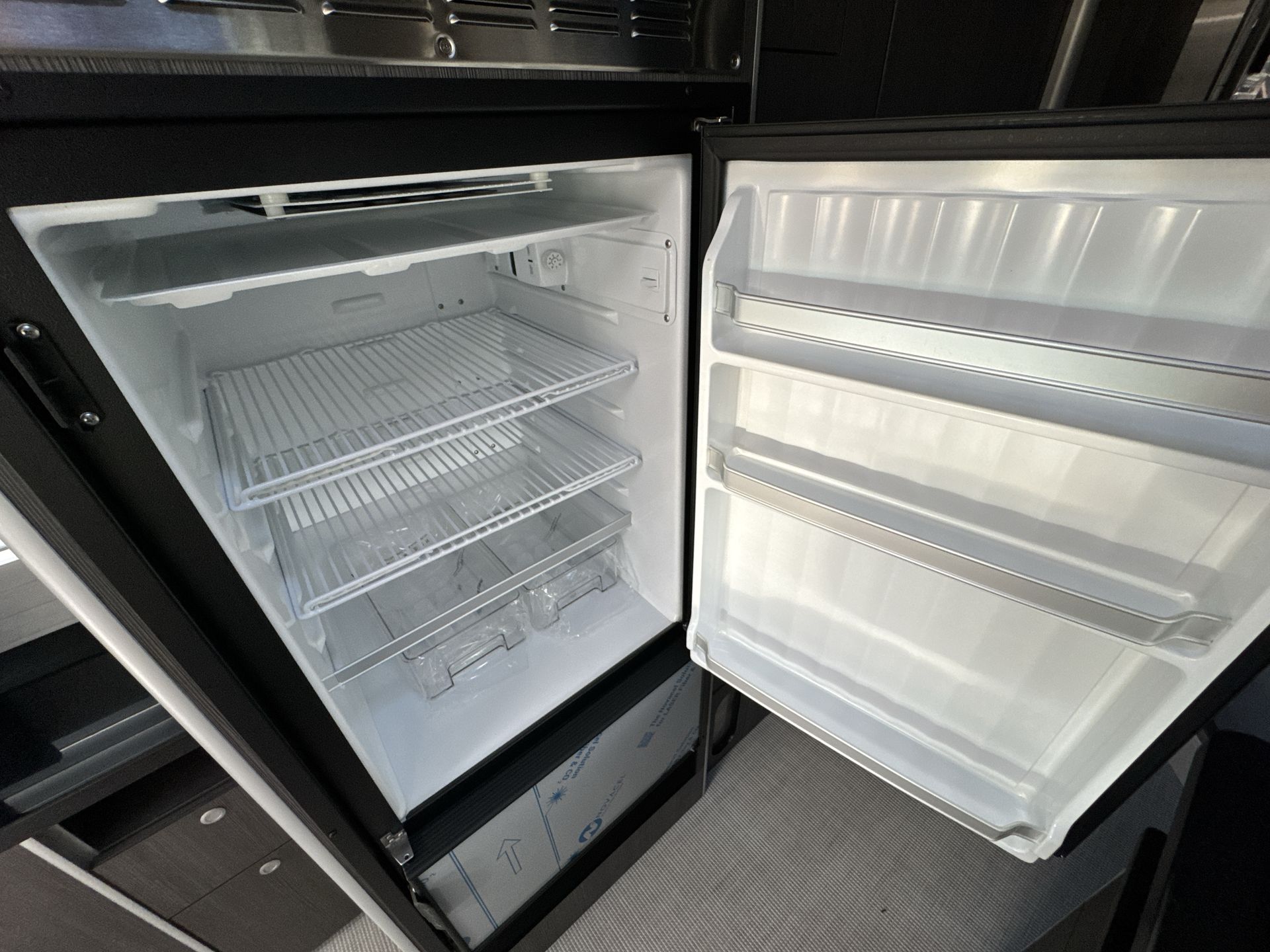 The kitchen is equipped with high-end appliances, including a two-burner gas stove, a convection microwave oven, and a mid-size refrigerator with a freezer. Solid-surface countertops, a large stainless steel Kohler® sink, and a slide-out pantry enhance both functionality and style, making it easy to prepare homemade meals on the road.