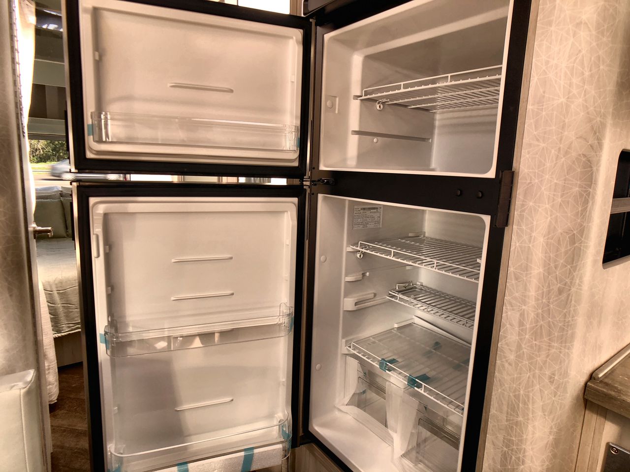 The rear of the trailer houses a comfortable queen bed, offering a private sleeping area. Surrounded by windows, this space provides natural light and scenic views. Additional sleeping options include convertible sofa beds, accommodating up to six people in total.