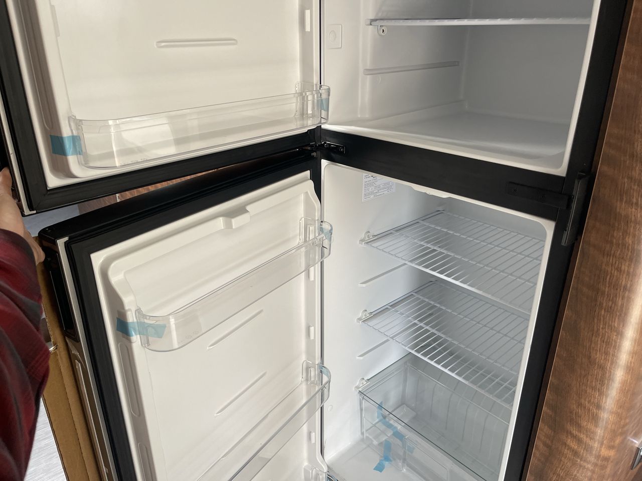 The kitchen is equipped with high-quality appliances, including a three-burner LP cooktop, oven, microwave, and a large refrigerator. Ample cabinet space ensures you have plenty of room to store all your cooking essentials, making meal preparation convenient whether you're at a campsite or on the road.