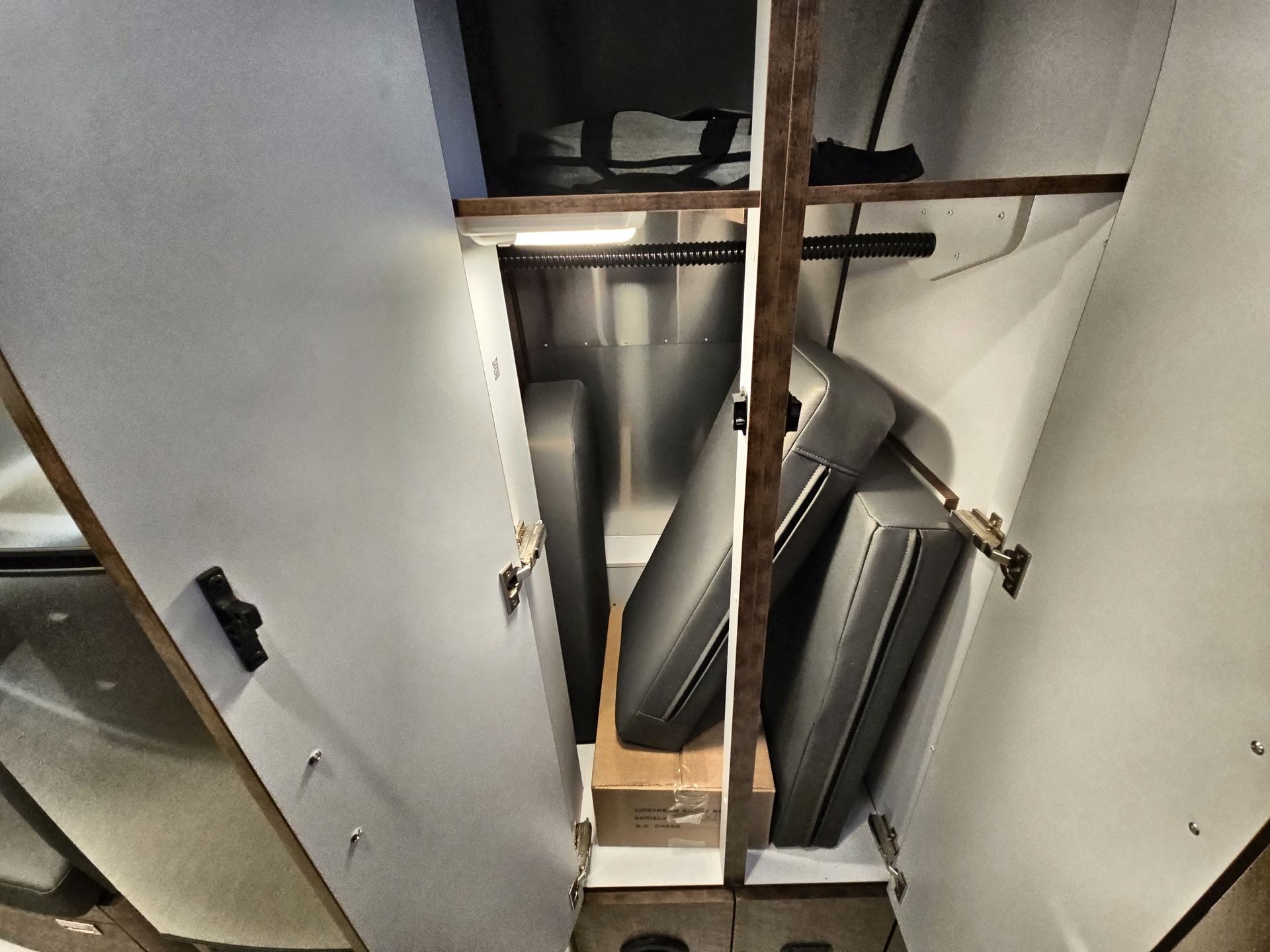 Storage is ample, with carefully designed cabinets and closets to store all your travel necessities securely. The bathroom features a separate shower and toilet area, providing privacy and convenience.