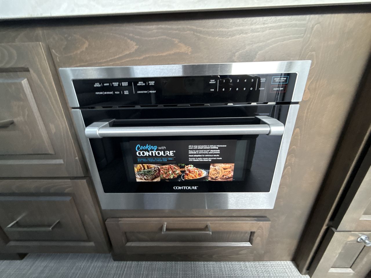 The kitchen is equipped with modern appliances, including a high-end stove, oven, convection microwave, and a large refrigerator. The ample counter space and storage make meal preparation both simple and enjoyable, catering to all your culinary needs on the road.