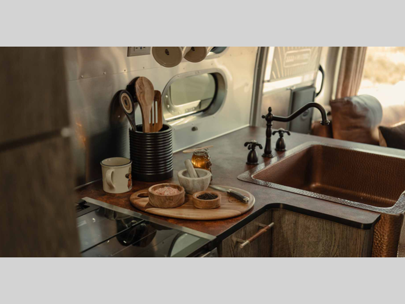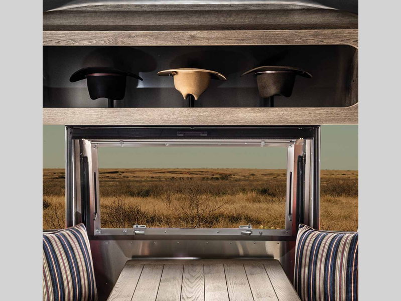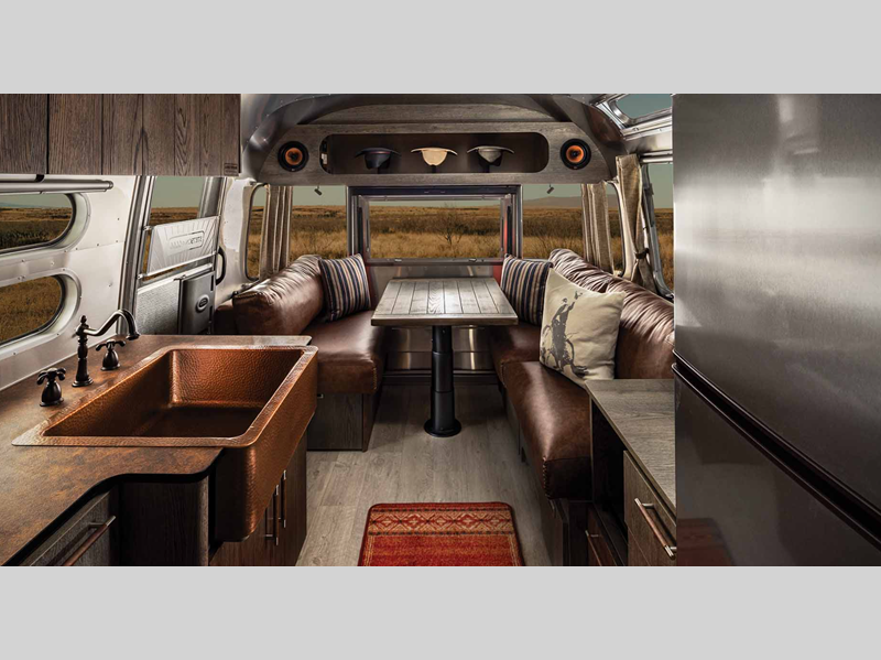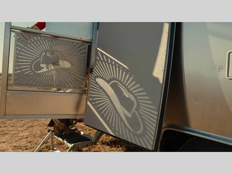 This 27-foot tribute features a collaboration between the hatmakers of Stetson and the ranchers of the Four Sixes Ranch in Texas, which will bring you premium finishes, handcrafted cabinetry, hat racks and leather seating, plus a copper front apron sink that will make you feel like you're back at the farm! The rear hatch will let you bring the outside in with wide open views and fresh air, and there is an overhead cabinet in the rear end cap, so you can easily grab your Stetson on the way out the door!
