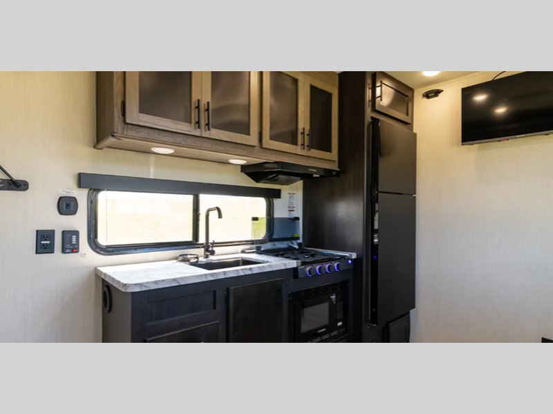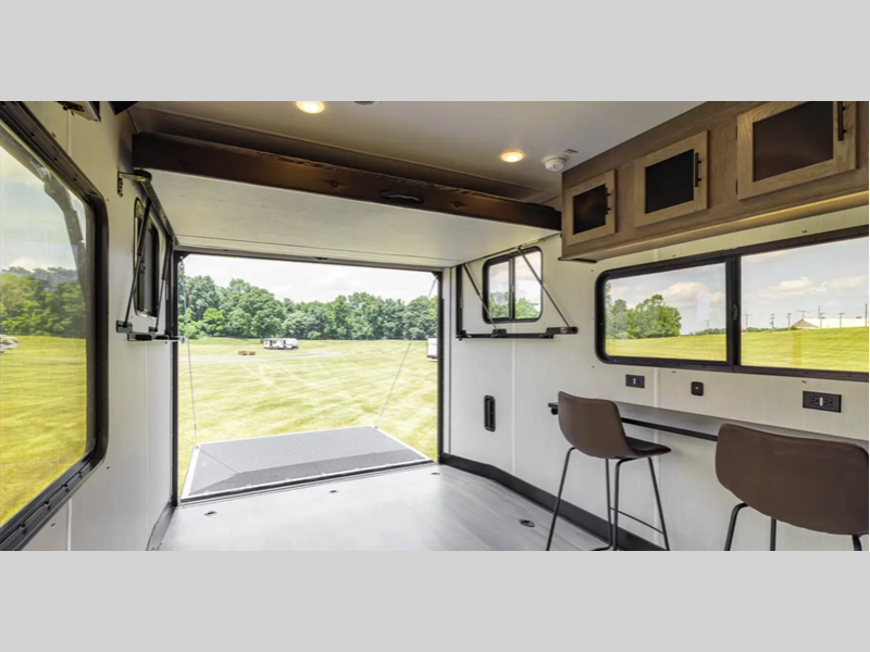 You will love the real wood cabinet doors and drawers inside, along with LED lights and a black stainless steel farm sink that will have you feeling more at home. There are power stabilizer jacks to make your RV more secure, and the power awning with LED accent lighting will create an outdoor space campground neighbors will want to check out.